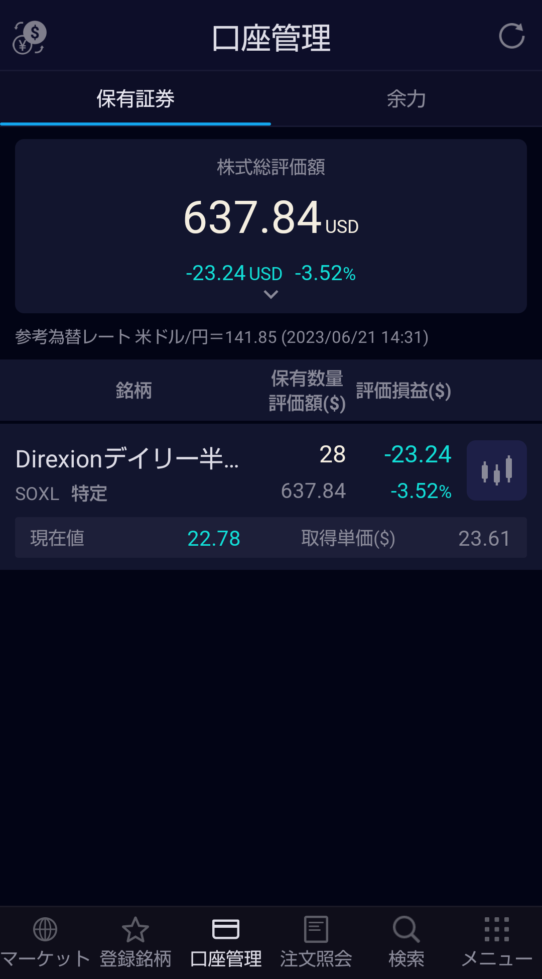 SOXLの直近最安値更新を肉眼で確認しました